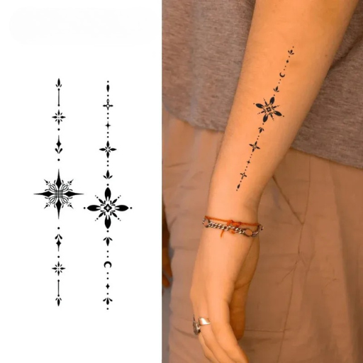 Un tatouage finement dessiné, comme un talisman. Il évoque l’alignement, la guidance intérieure et la lumière qui nous traverse. Idéal pour celles qui avancent en conscience, connectées à leur propre chemin.